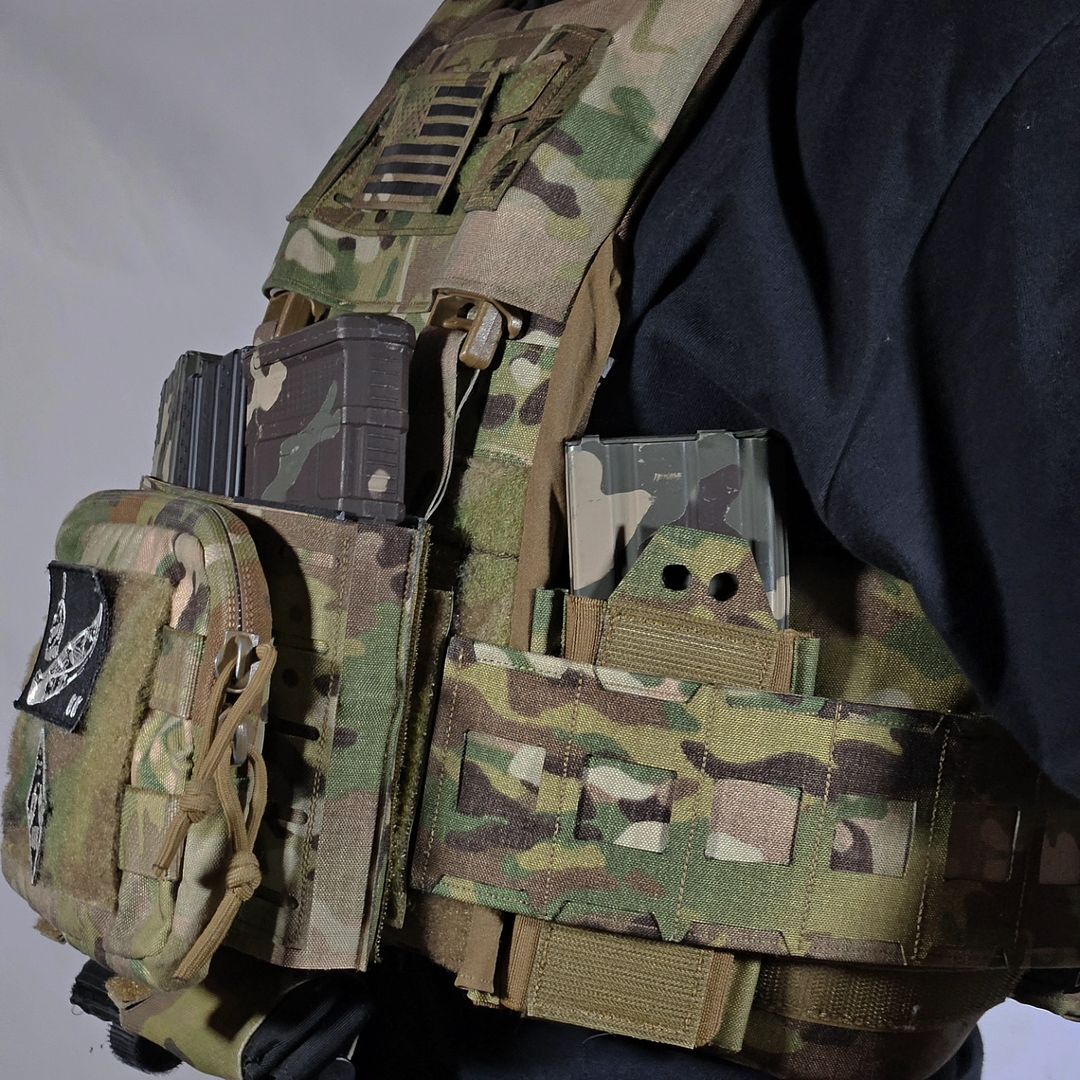The SSC comes with standard hook and loop velcro mounting at the front and rear. QD mounting options such as First Spear Tubes can be added on for an additional fee, either hard sewn to the cummerbund or a separate adaptor that slides into the molle. (note: If choosing to have Tubes hard sewn to the SSC, one molle row will be removed to account for the length of the Tubes)